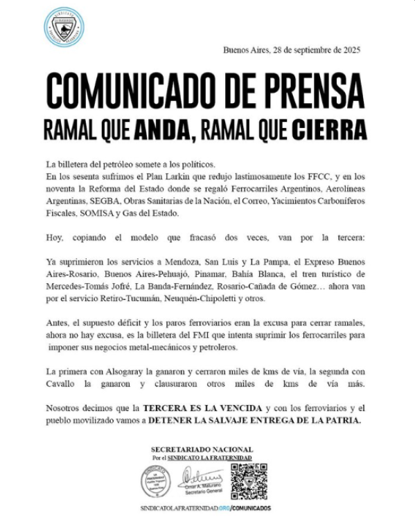 En el pronunciamiento, La Fraternidad vinculó la situación actual con los procesos de desmantelamiento ferroviario de décadas anteriores, y advirtió que la cancelación de servicios de Trenes Argentinos implica una continuidad de políticas que perjudican la red nacional.