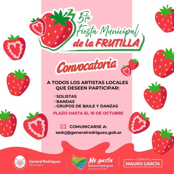 La Fiesta Municipal de la Frutilla 2025 se prepara en General Rodríguez y, como cada año, contará con un importante espacio para los talentos locales. En este sentido, desde la Municipalidad se abrió la convocatoria a solistas, bandas, grupos de baile y danzas.