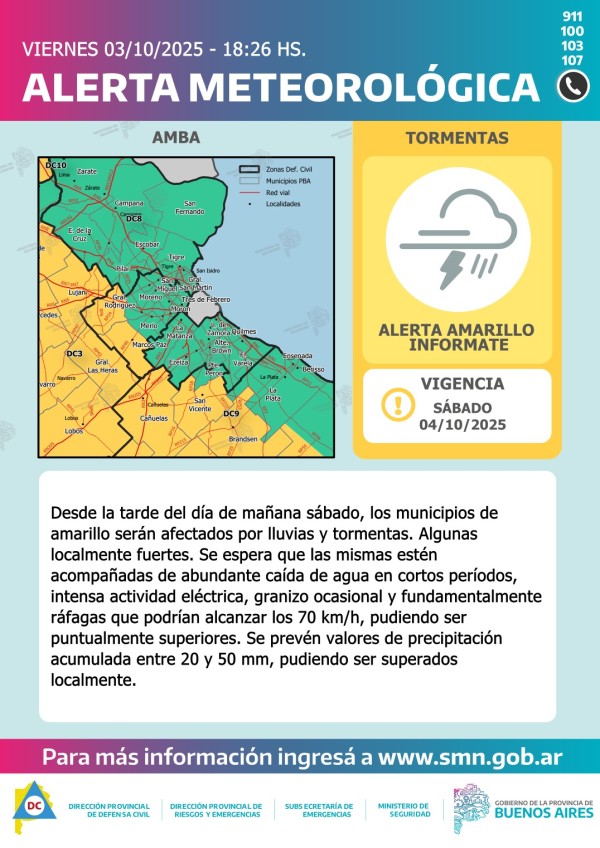 Según los reportes oficiales, para la tarde y noche de este sábado 4 de octubre rige un alerta amarillo que anticipa lluvias y tormentas de variada intensidad. Las precipitaciones podrían ser localmente fuertes, con abundante caída de agua en cortos períodos, ráfagas de viento de hasta 70 km/h, ocasional caída de granizo y actividad eléctrica intensa. Se esperan acumulados de entre 20 y 50 mm.