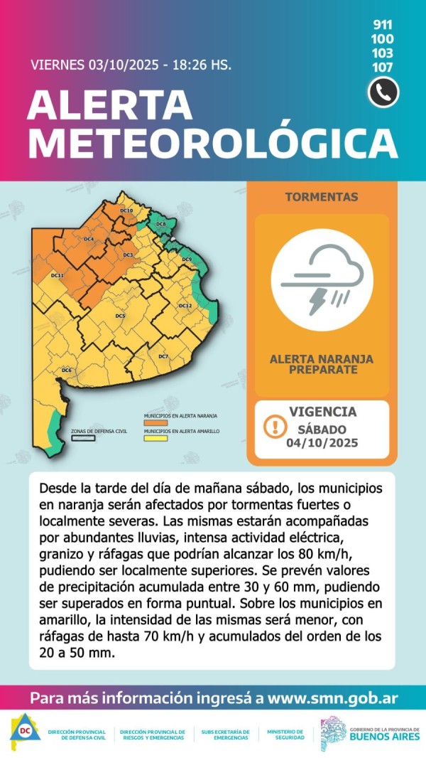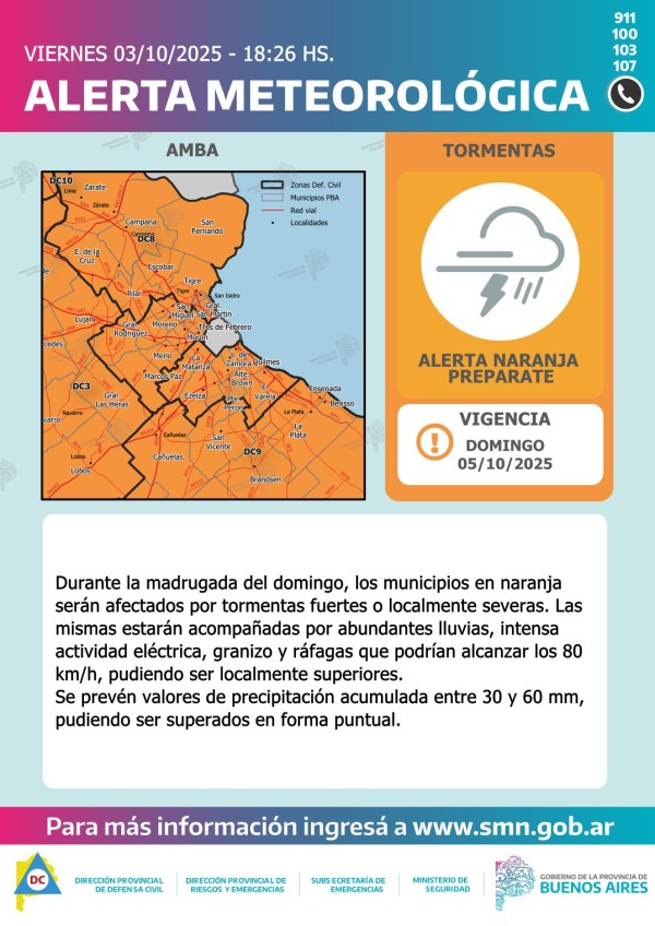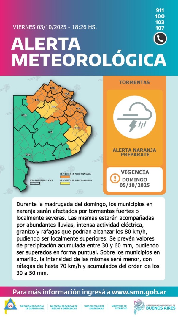 Para la madrugada y mañana del domingo 5 de octubre, la situación se tornará más severa: nuestro distrito pasará a estar bajo alerta naranja, lo que implica la posibilidad de tormentas fuertes o localmente severas, acompañadas de ráfagas que podrían alcanzar los 80 km/h, abundante lluvia, intensa actividad eléctrica y caída de granizo. En este caso, los acumulados de agua previstos se ubican entre 30 y 60 mm, aunque podrían superarse de manera puntual.