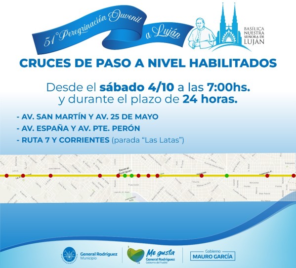 Este sábado, 4 de octubre, desde las 7 de la mañana y por 24 horas, General Rodríguez dispondrá de pasos a nivel habilitados especialmente para garantizar la seguridad de los miles de fieles que participarán en la 51ª Peregrinación Juvenil a Luján.