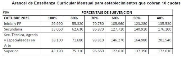 Para Inicial y Primaria, los aranceles máximos de octubre de 2025 quedaron en $29.990 con 100% de subvención. Con 80% de aporte, el tope se ubicó en $55.320, mientras que con 70% alcanzó $70.750. Para escuelas con 60% de subsidio, el máximo llegó a $105.960; con 50%, a $123.280; y con 40%, a $135.530. Estos importes aplicaron en instituciones que cobraron 10 cuotas a lo largo del ciclo lectivo.
