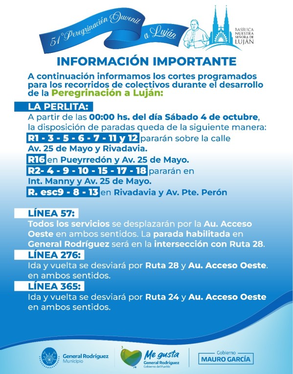 Debido a los cortes programados por la 51ª Peregrinación Juvenil a Luján, varias líneas de colectivos modificarán sus recorridos en General Rodríguez desde las 00:00 de este sábado 4 de octubre.