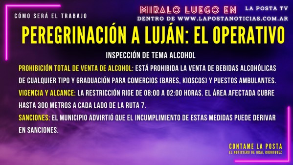 Una medida estricta, amparada por una ley provincial, será la prohibición total de la venta de bebidas alcohólicas. La restricción regirá desde las 8 de la mañana hasta las 2 de la madrugada y afectará a todos los comercios, bares, kioscos y puestos ambulantes en una franja de 300 metros a cada lado de la Ruta 7. Guerra advirtió que el incumplimiento puede acarrear sanciones como multas económicas y clausuras. "Los comerciantes ya saben y de hecho no lo hacen. Hay comercios que prefieren cerrar en ese momento y después abrir cuando pase el horario de restricción", comentó.