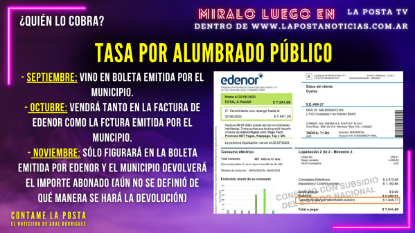 • Noviembre: Se presume que la tasa figurará únicamente en la factura de Edenor, volviendo al sistema anterior. El Municipio debería devolver el importe abonado de octubre, aunque no está definido aún de qué manera se hará la devolución.