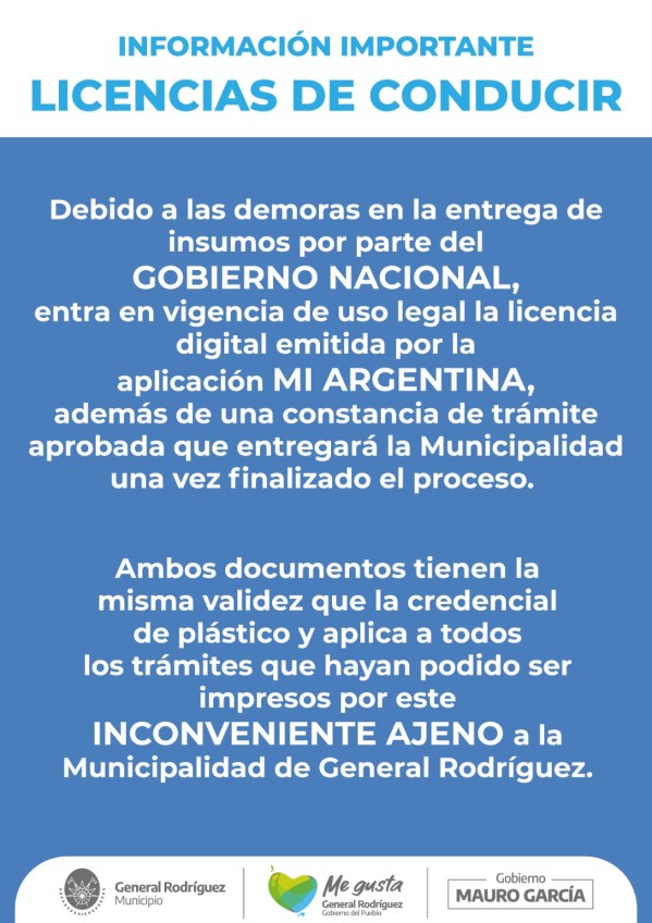 La Municipalidad de General Rodríguez informó que, debido a demoras en la entrega de insumos por parte del Gobierno Nacional, entró en vigencia el uso legal de la licencia digital emitida por la aplicación Mi Argentina.