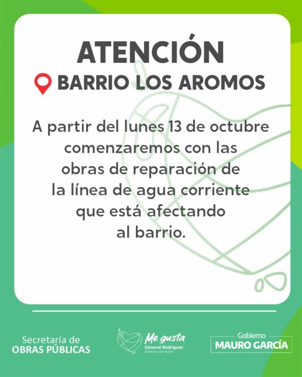 La Municipalidad de General Rodríguez, a través de la Secretaría de Obras, Servicios Públicos y Vivienda, anunció que este lunes, 13 de octubre, se dará inicio a una obra de reparación muy esperada por los vecinos del barrio Los Aromos.