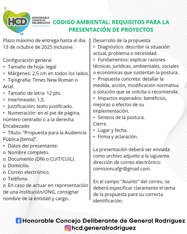 Se ha establecido un plazo para que los ciudadanos sigan enviando sus sugerencias. Los interesados pueden presentar sus propuestas hasta el lunes 13 de octubre a las 23:59 hs a través del correo electrónico [email protected].