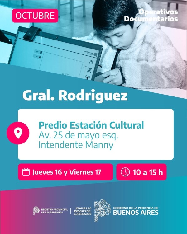 El Registro Provincial de las Personas, dependiente del Gobierno de la provincia de Buenos Aires, anunció un nuevo operativo de documentación que se llevará a cabo en General Rodríguez durante esta semana.