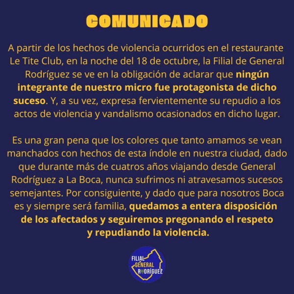 La Filial Boca Juniors General Rodríguez emitió un comunicado oficial centrado en repudiar los actos de vandalismo y violencia, y en aclarar su total desvinculación con los agresores.
