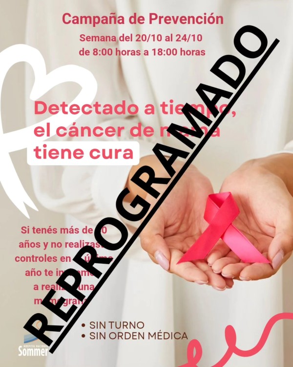 El Hospital Nacional "Dr. Baldomero Sommer" se vio obligado a suspender temporalmente la campaña de prevención del cáncer de mama que había anunciado días atrás, en el marco de las actividades por el “Mes Rosa”. La decisión se tomó debido a “dificultades técnicas en algunos equipamientos”, según comunicó desde su cuenta oficial