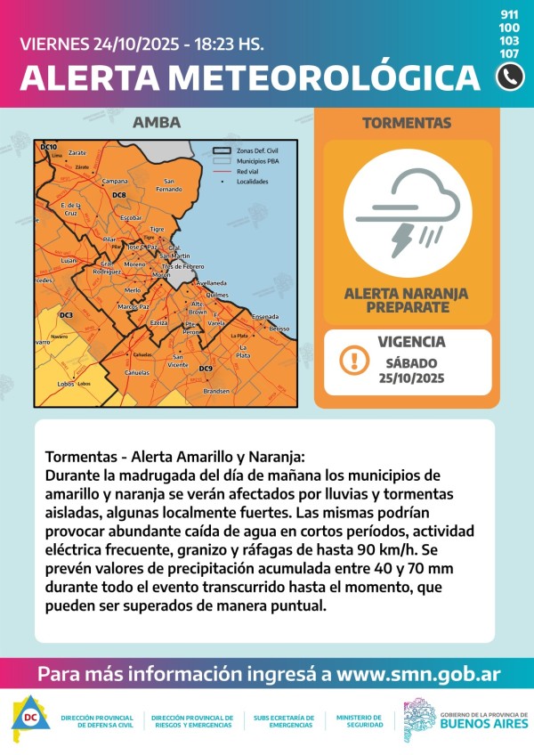 El Servicio Meteorológico Nacional emitió una alerta meteorológica de nivel naranja para el Área Metropolitana de Buenos Aires (AMBA) y alrededores, vigente para este sábado 25 de octubre, que incluye a General Rodríguez entre los municipios bajo vigilancia por tormentas fuertes. Enterate de los detalles en esta nota.