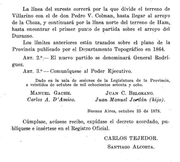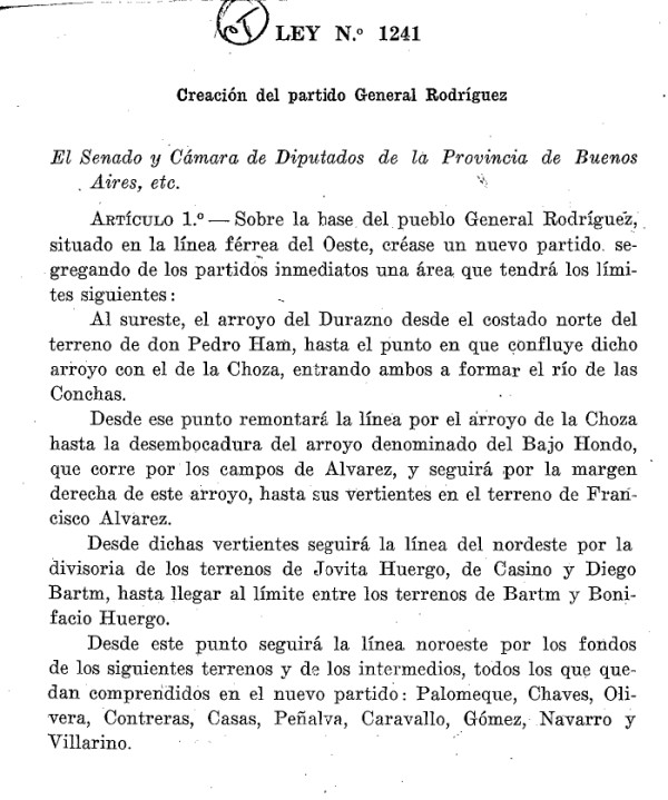 La Ley apobada por el Senado y la Cámara de Diputados bonaerenses de ese turno establecía la creación del nuevo partido de General Rodríguez, sobre la base del pueblo fundado el 12 de mayo de 1864.