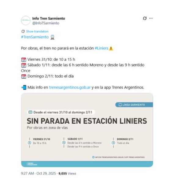Trenes Argentinos informó que, entre el viernes 31 de octubre y el domingo 2 de noviembre, el tren Sarmiento no se detendrá en la estación Liniers. La medida forma parte de las obras incluidas en la Emergencia Ferroviaria decretada por el Gobierno Nacional, que busca mejorar la infraestructura y la seguridad del sistema ferroviario