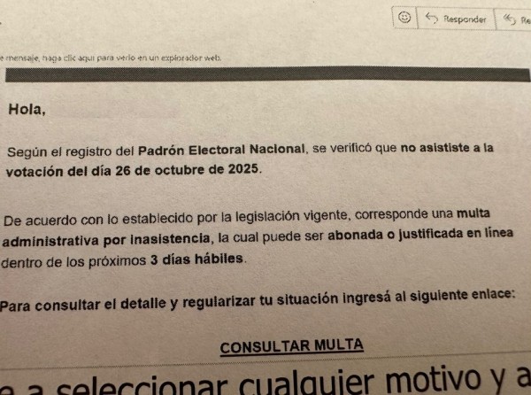 "Desde la Justicia Nacional Electoral no se envía ningún correo electrónico de esta índole", aseguró la CNE e informó que quienes no hayan concurrido a votar deberán ingresar en el sitio https://infractores.padron.gov.ar/ para corroborar su situación y poder regularizarla.