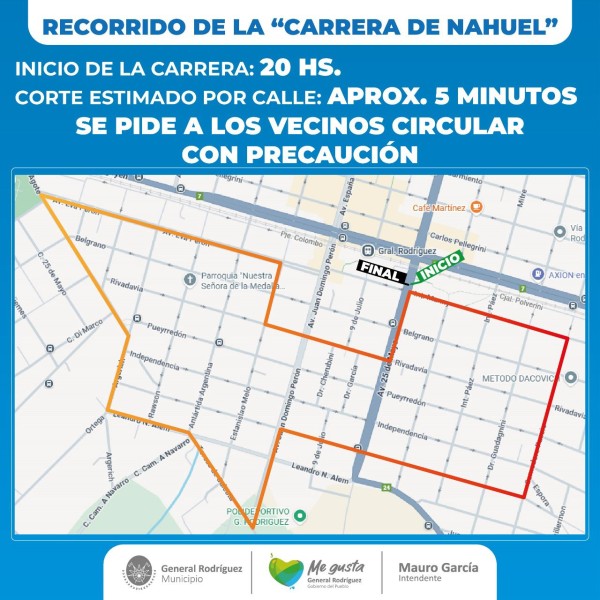 Desde el municipio se informó que cada calle permanecerá cortada durante aproximadamente 5 minutos para permitir el paso de los participantes, por lo que se solicita a los vecinos circular con precaución por las zonas señaladas.