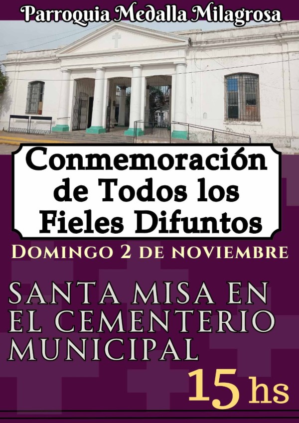 La Parroquia de la Medalla Milagrosa anunció que este domingo 2 de noviembre se llevará a cabo una Conmemoración de Todos los Fieles Difuntos. El sacerdote Alejandro Trobo, como todos los años, estará presente para acompañar a las familias en el Cementerio Municipal desde las 15 hs