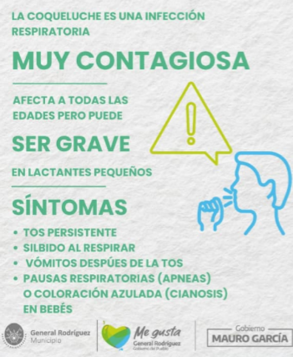 La Secretaría de Salud Pública del Municipio de General Rodríguez impulsa una campaña de información y prevención sobre la Coqueluche, también conocida como tos convulsa, una enfermedad respiratoria altamente contagiosa que puede ser grave en lactantes pequeños.