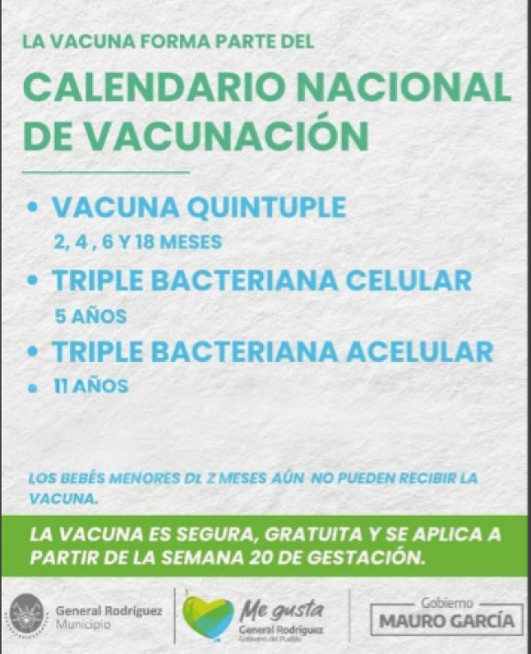 La Secretaría de Salud Pública del Municipio de General Rodríguez impulsa una campaña de información y prevención sobre la Coqueluche, también conocida como tos convulsa, una enfermedad respiratoria altamente contagiosa que puede ser grave en lactantes pequeños.