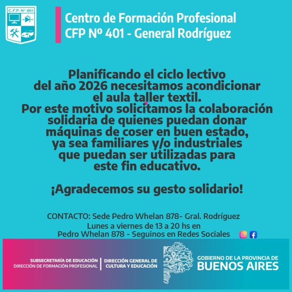 "Planificando el ciclo lectivo del año 2026, necesitamos acondicionar el aula taller textil. Por este motivo solicitamos la colaboración solidaria de quienes puedan donar máquina de coser en buen estado, ya sea familiares y/o industriales que puedan ser utilizadas para este fin educativo", explicaron.