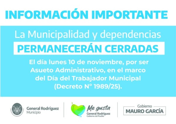 La Municipalidad de General Rodríguez y todas sus dependencias permanecerán cerradas al público este lunes 10 de noviembre, en conmemoración del Día del Trabajador Municipal, según lo establecido por el Decreto Nacional N.º 1989/25.