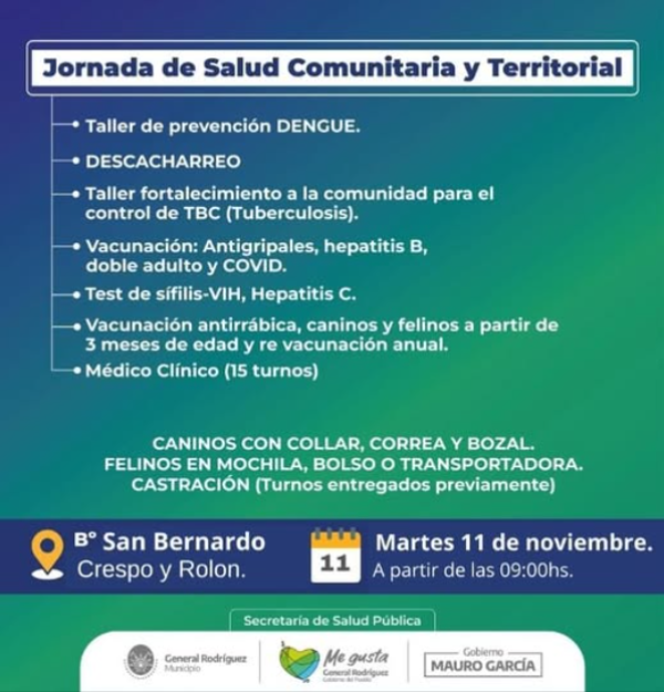 La Secretaría de Salud Pública del Municipio de General Rodríguez realizará una nueva Jornada de Salud Comunitaria y Territorial este martes 11 de noviembre, a partir de las 09:00 horas, en el barrio San Bernardo, específicamente en las calles Crespo y Rolón.