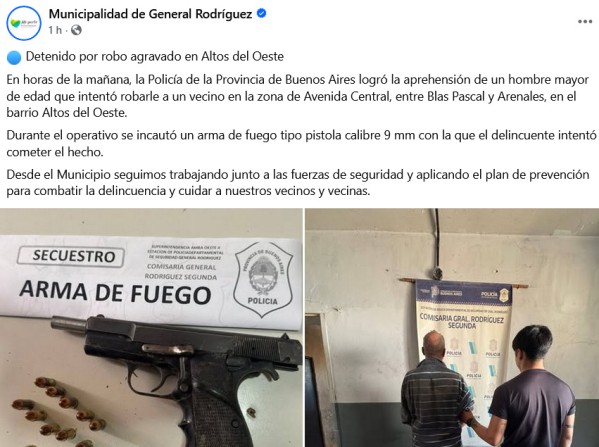 Uno de los casos más resonantes ocurrió en el barrio Altos del Oeste, sobre la Avenida Central al 3700, en horas de la mañana del lunes 3 de noviembre. Un sujeto intentó robarle a un comerciante cuando abría su local de compra y venta de metales. Forcejearon, hubo golpes y la situación no fue resuelta por la Policía, sino que fueron los propios vecinos quienes lo detuvieron y lo entregaron a las fuerzas de seguridad, que le secuestraron un arma de fuego al ladrón.