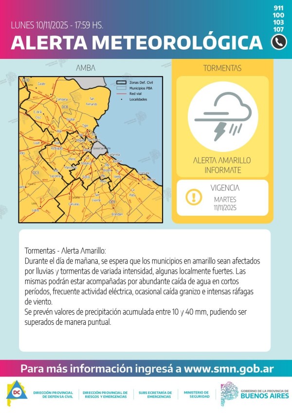 El Servicio Meteorológico Nacional emitió una alerta amarilla por tormentas para este martes 11 de noviembre que abarca a General Rodríguez y otros municipios del Área Metropolitana de Buenos Aires (AMBA).