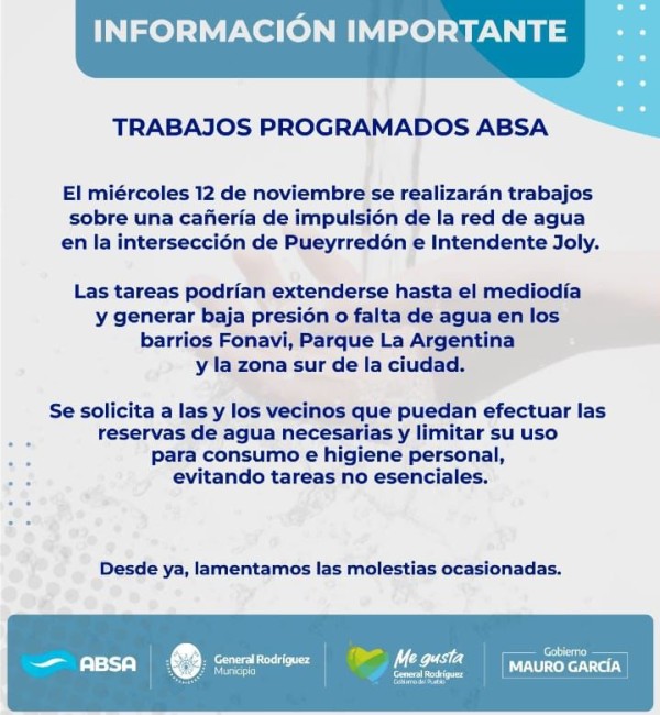 La empresa ABSA informó que el miércoles 12 de noviembre se llevarán adelante trabajos programados sobre una cañería de impulsión de la red de agua en la intersección de Pueyrredón e Intendente Joly, en la zona sur de General Rodríguez.