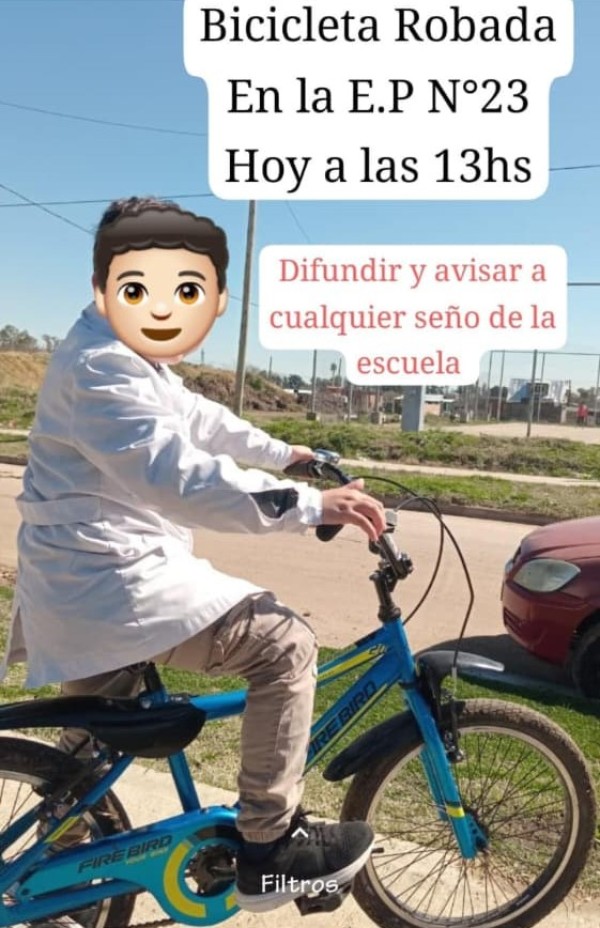 Un chico de 7 años sufrió el hurto de su bicicleta desde adentro de la Escuela Primaria Nº23 del barrio Marabó a la que asiste regularmente. El ilícito sucedió el pasado viernes 7 de noviembre al parecer alrededor de las 13.15 hs.