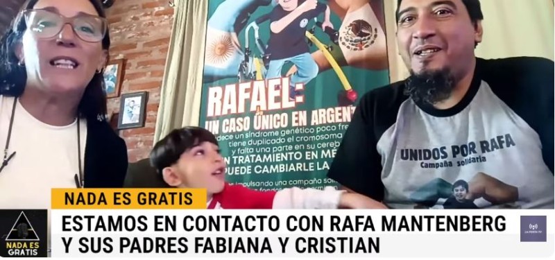 La lucha por Rafael Mantenberg: su familia habló emocionada en el último programa de "Nada es Gratis TV" con su desafío contra un cuadro clínico "único en el mundo". Su mamá Fabiana y su papá Cristian, con la fecha de viaje confirmada, apelan a la solidaridad para alcanzar la cifra de 80.000 dólares que permitirá a su hijo recibir un tratamiento de regeneración neuronal en México