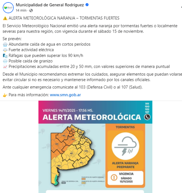 El Servicio Meteorológico Nacional emitió una alerta naranja por tormentas fuertes o localmente severas para nuestra región, con vigencia durante el sábado 15 de noviembre.