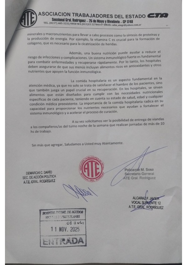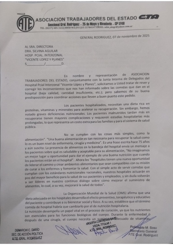 “Los pacientes hospitalizados necesitan una dieta rica en proteínas, vitaminas y minerales para acelerar su recuperación. Sin embargo, hemos notado graves deficiencias nutricionales”, expresaron desde ATE Gral. Rodríguez en la nota ingresada este martes, 11 de noviembre, en la Dirección del Hospital.