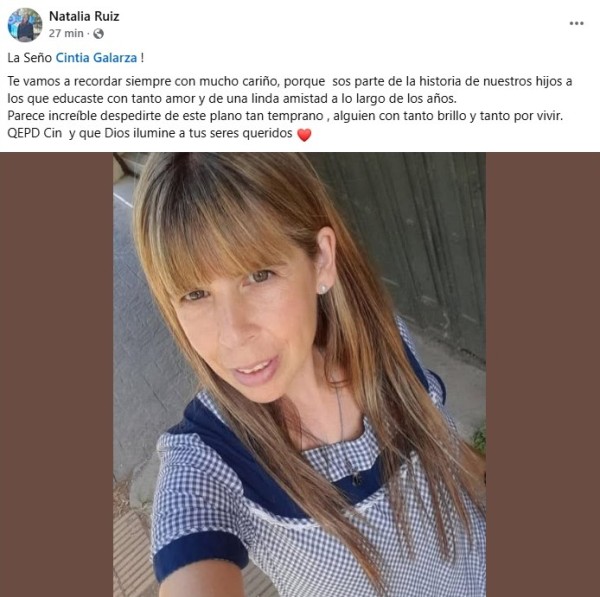 Por último, la concejal de Compromiso por Gral. Rodríguez Natalia Ruiz compartió una foto de Cintia con guardapolvo de maestra jardinera junto al siguiente mensaje: "La Seño Cintia Galarza! Te vamos a recordar siempre con mucho cariño, porque sos parte de la historia de nuestros hijos a los que educaste con tanto amor y de una linda amistad a lo largo de los años. Parece increíble despedirte de este plano tan temprano, alguien con tanto brillo y tanto por vivir. QEPD Cin y que Dios ilumine a tus seres queridos".