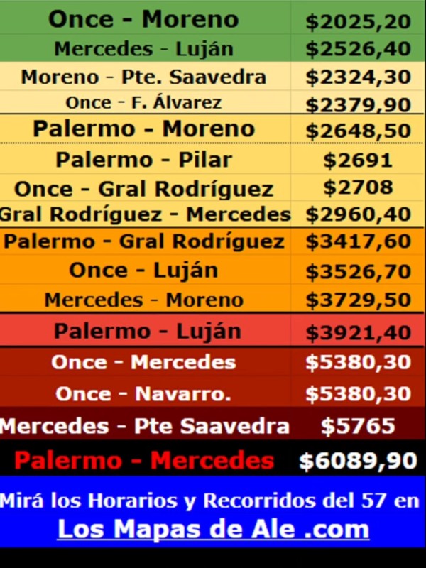 Agradecemos por el tarifario a Los Mapas de Ale, donde también quienes lo deseen pueden visitar los horarios y recorridos de la línea 57, entre otros trucos y servicios de viaje. (https://www.losmapasdeale.com/losmapasdeale/gua-completa-de-la-lnea-57-todos-los-ramales-sus-horarios-y-recorridos-en-un-solo-lugar)