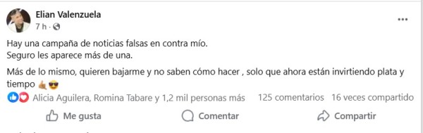 Mientras tanto, Elián ya se manifestó en las redes diciendo que es víctima de una operación de noticias falsas, por las cuales hay gente que lo "quiere bajar" y que por ello gastan tiempo y dinero".