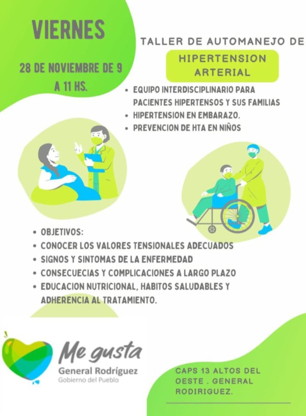 De acuerdo a lo informado en el Flyer emitido por el municipio, el Taller de Automanejo de Hipertensión Arterial se llevará a cabo en el CAPS N.º 13 del barrio Altos del Oeste, en el orario de 9:00 a 11:00 horas.