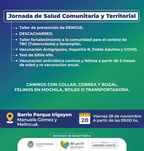 Por otro lado, también se realizará una Jornada de Salud Comunitaria y Territorial en Manuela Gómez y Melincué, en el barrio Parque Irigoyen, desde las 09:00 horas.
