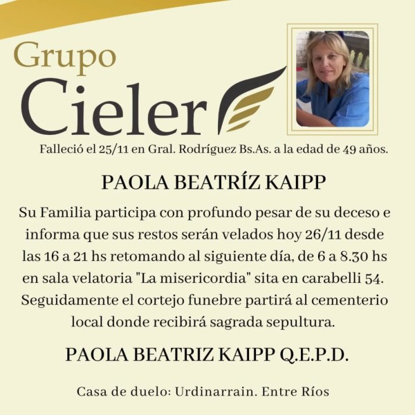Aunque fue el pasado martes 25 de noviembre, trascendió en las últimas horas el fallecimiento de Paola Beatriz Kaipp, rodriguense "por adopción" desde hace más de dos décadas, vecina del barrio Villa Ángela, y trabajadora en el área de limpieza y mantenimiento de la Sala 8 de Maternidad del Hospital Vicente López. Tenía 49 años
