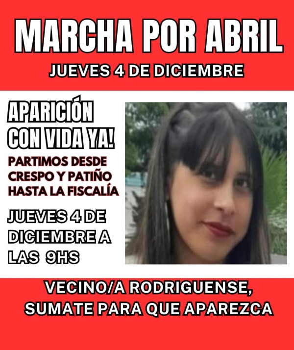 La manifestación se realiza apenas unas semanas después de que se cumplieran 60 días de la desaparición de Abril, ocurrida el pasado 18 de septiembre. La adolescente se habría marchado presuntamente con Cristian Esteban Velazco, un hombre de 32 años con antecedentes de violencia de género, contra quien la familia de Abril ya había impuesto una denuncia y una perimetral en Buenos Aires.
