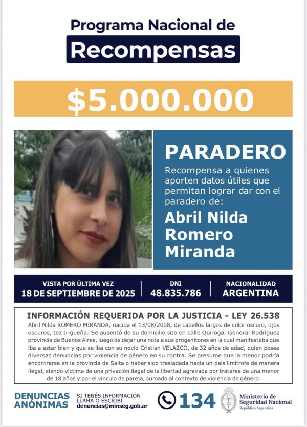 Ante la falta de avances, el caso fue escalando a nivel nacional. El pasado 20 de noviembre, el Gobierno nacional, a través del Ministerio de Seguridad por entonces conducido por Patricia Bullrich, emitió una Resolución (Nº 1316/2025) que estableció una recompensa de $ 5.000.000 para quienes aporten información veraz y útil que permita encontrar a la joven. La decisión de ofrecer la recompensa surgió luego de que la Unidad Funcional de Instrucción Nº 9 de Moreno–Gral. Rodríguez, a cargo de la fiscal Alejandra Rodríguez, descartara que se trate de una fuga voluntaria.