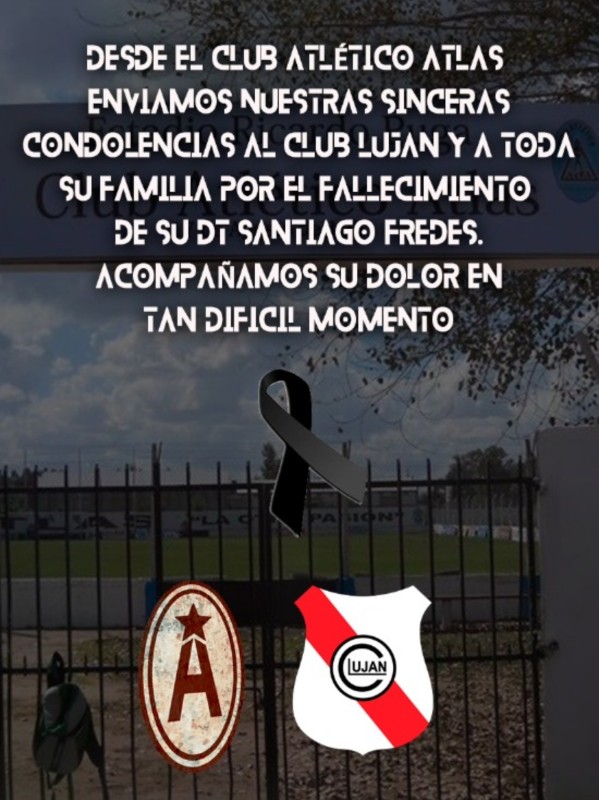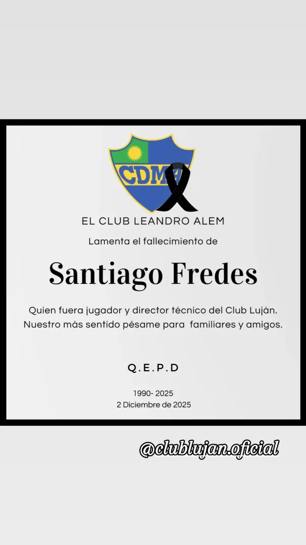 Por su parte, el posteo que comunicó el "Marrón" dice lo siguiente: "Lamentamos el fallecimiento de Santiago Fredes, entrenador del Club Luján. Abrazamos a la institución vecina en este difícil momento y enviamos nuestras condolencias a su familia, amigos y seres queridos. QEPD".