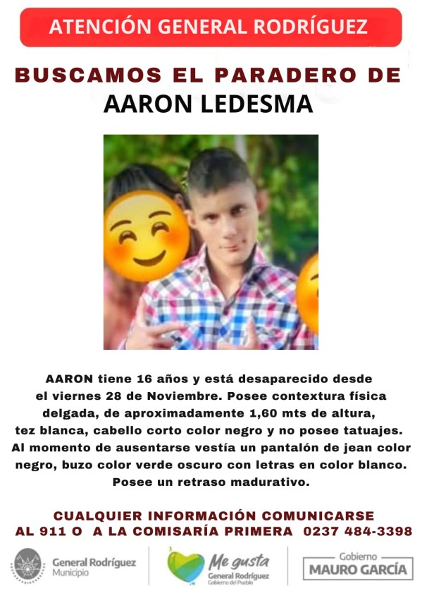 La comunidad de General Rodríguez se encuentra en alerta por la desaparición de Aaron Ledesma, un joven de 16 años que se encuentra ausente desde el viernes 28 de noviembre y cuyo paradero aún es desconocido.