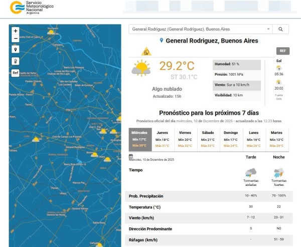 Según el pronóstico, se esperan lluvias y tormentas en gran parte de la provincia de Buenos Aires, incluido el AMBA y por ende Gral. Rodríguez, principalmente a partir de la tarde. Las tormentas serían aisladas por la tarde y fuertes por la noche, elevándose el nivel de alerta de verde a amarillo.