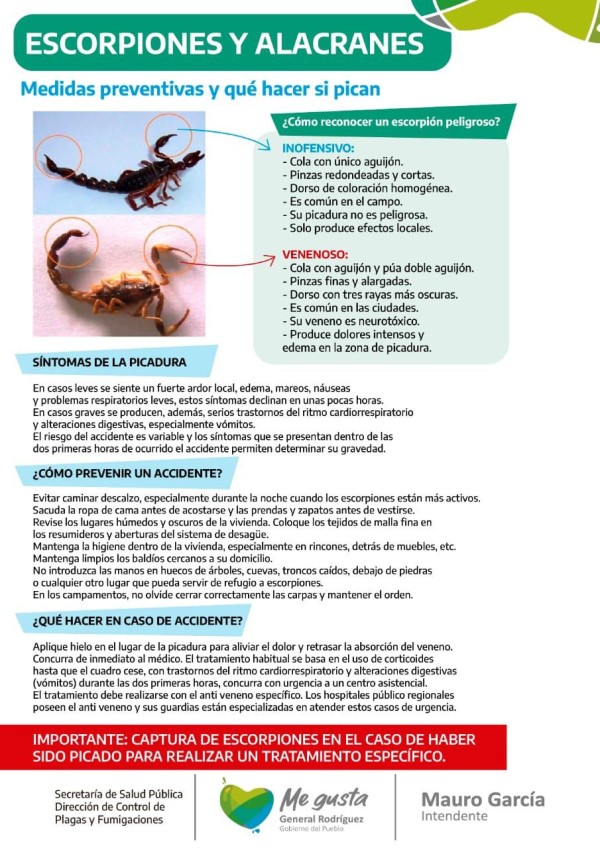 En los últimos días, se registró la presencia de alacranes en distintos sectores de General Rodríguez, según informaron vecinos y confirmaron áreas municipales. Ante esta situación, desde la Dirección de Control de Plagas y Fumigaciones y la Secretaría de Salud Pública se emitió un comunicado para reforzar las medidas de prevención y el manejo adecuado frente a posibles hallazgos.