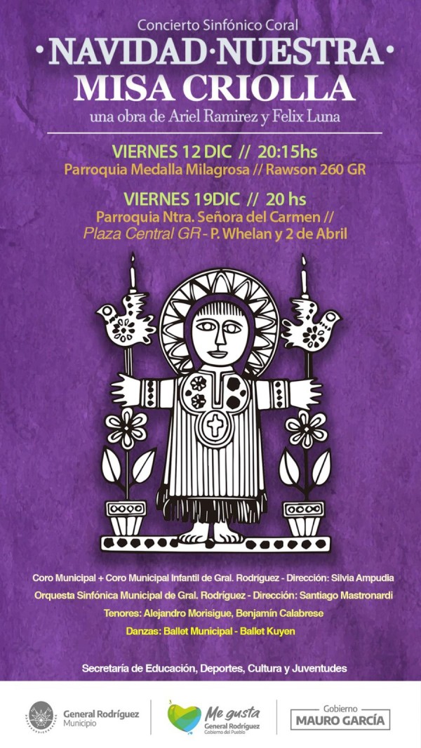 La Secretaría de Educación, Deportes, Cultura y Juventudes del Municipio de General Rodríguez invita a toda la comunidad a disfrutar de dos presentaciones de Navidad Nuestra – Misa Criolla, la célebre obra de Ariel Ramírez y Félix Luna, en versión sinfónico-coral.