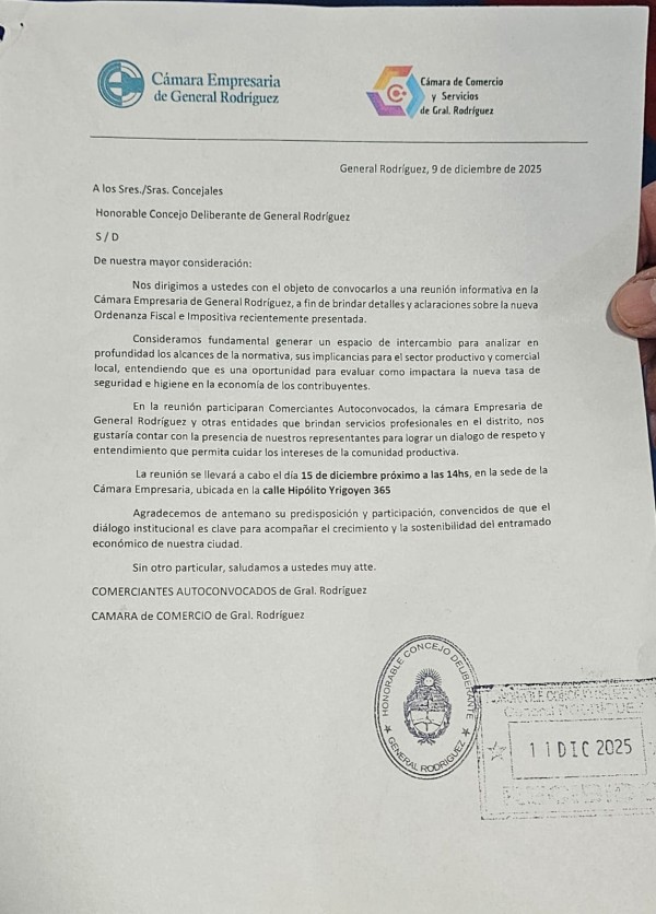 Con el pedido ya ingresado al HCD y sellado el 11 de diciembre de 2025, ahora será decisión de los concejales atender la convocatoria y participar del encuentro previsto para este lunes 15, a las 14 horas, donde el sector comercial espera poder despejar dudas y plantear propuestas antes de la aprobación final de la Ordenanza Fiscal e Impositiva.