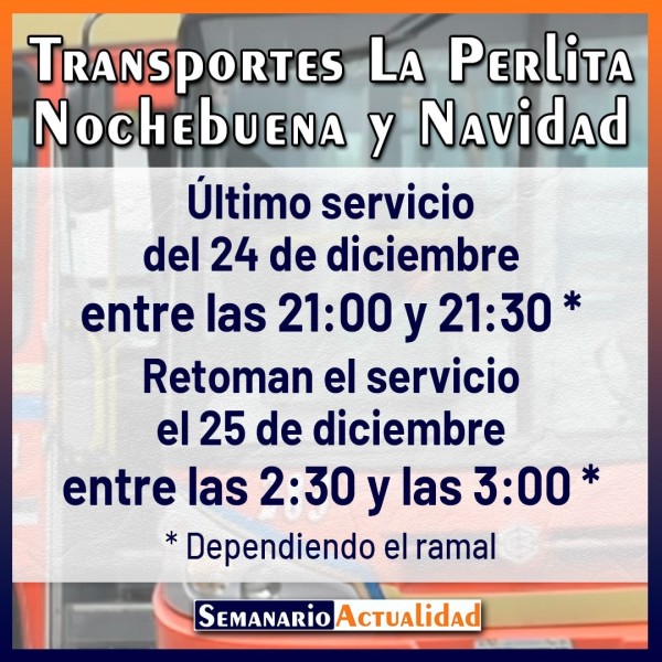 Teniendo en cuenta que muchos vecinos de la región lo venían consultando en los últimos días, Transportes La Perlita difundió horas atrás cómo serán los servicios para Nochebuena y Navidad, más concretamente para las horas finales de este miércoles 24 de diciembre y las primeras del jueves 25.