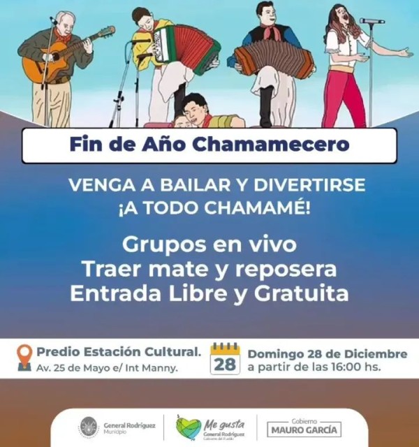 El Municipio de General Rodríguez organiza el "Fin de Año Chamamamecero", un evento que se realizará este domingo 28 de diciembre en el Predio Estación Cultural.