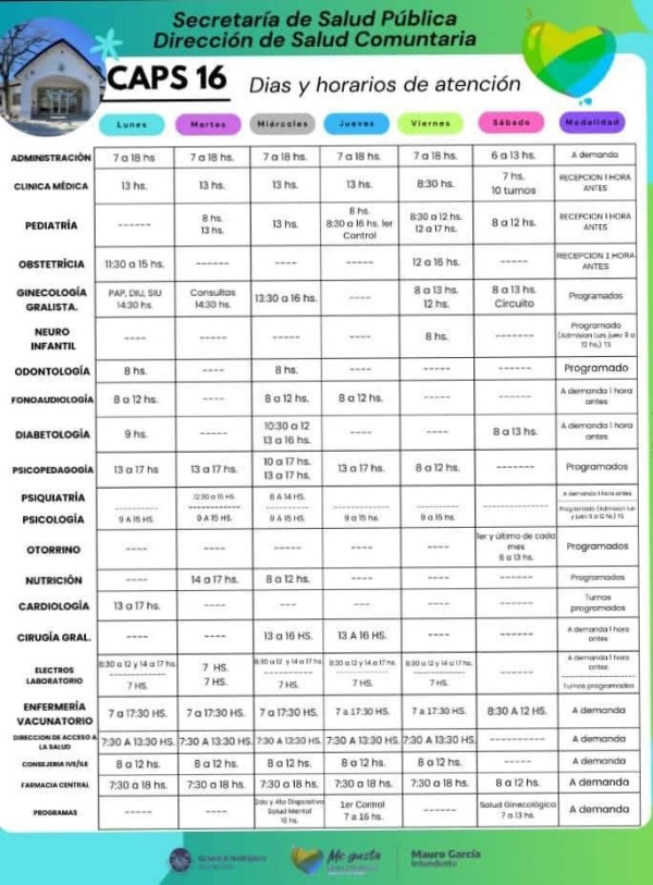 Para mayor precisión en turnos y especialidades, se recomienda acercarse con anticipación o consultar directamente en el CAPS 16.